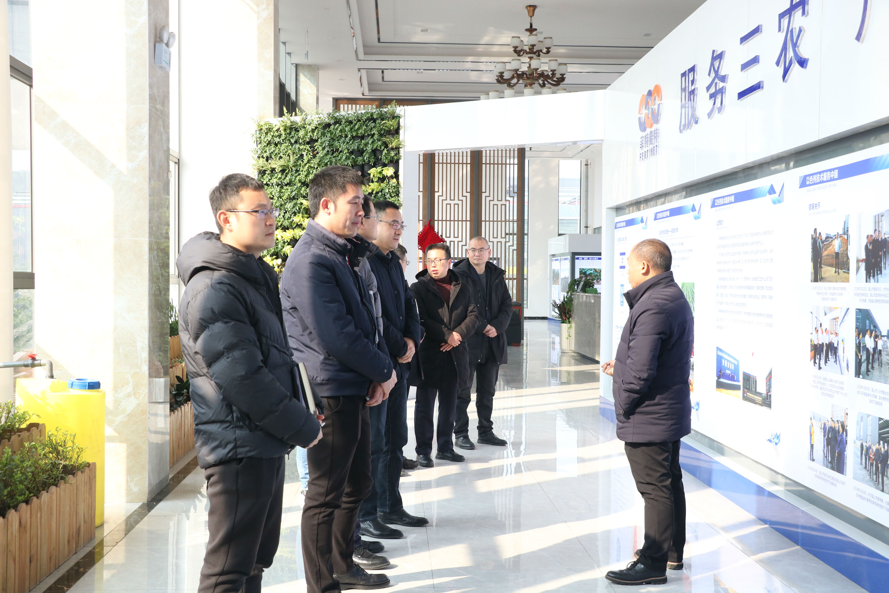 2月9日,由成都天府新区农业投资有限公司副总经理陈立华、成都天府新区农业投资有限公司投资发展部部长、成都天投成果转化科技有限公司总经理赵明骥、成都天府新区农业投资有限公司合约法务部部长冯波、成都天投成果转化科技有限公司副总经理陈锐,以及成都天府新区农业投资有限公司合约法务部肖辉明、成都天投成果转化科技有限公司杨旭、唐康杰等组成的考察团来到菲特能特丹棱基地考察调研,集团董事长魏刚、副总裁余庭洋、张洪林陪同。
